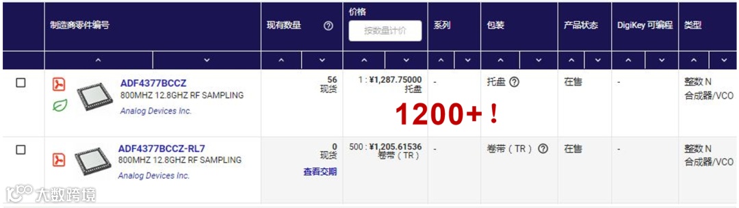 ADF4377👈的Logo显示该芯片设计于2020年,这是一颗180nm制程,面积约13mm2的芯片。平台君还查询到这款芯片在得捷网站上的售价在千元以上!