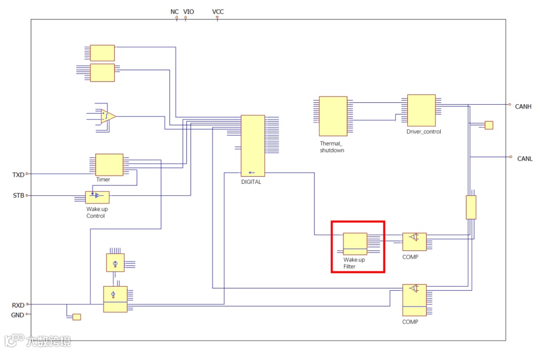 引脚Vio还为收发器的低功率差分接收器提供内部电源电压。即使在引脚Vcc上没有电源电压,也允许检测唤醒请求。