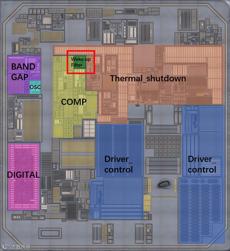 NCV7344是由三层金属和一层多晶构成的CMOS制造工艺的350nm芯片,从概貌图和电路图我们都可以看到有关唤醒的模块。