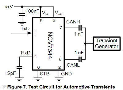 引脚CANH和CANI受到汽车电气瞬变的保护。如果输入断开,引脚TxD和STB在内部被拉高。引脚TxD、STB和RxD将浮动,防止反向供电,VCC电源被移除。