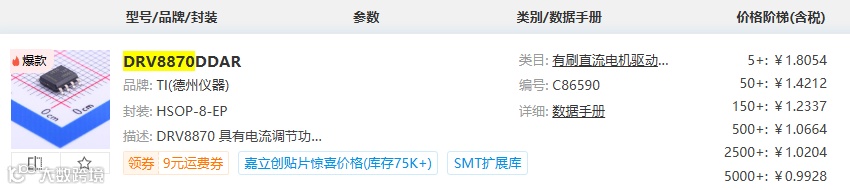 最后附上平台君在立创商城为大家查询到DRV8870芯片价格,单颗含税价格大约在2块钱的样子。