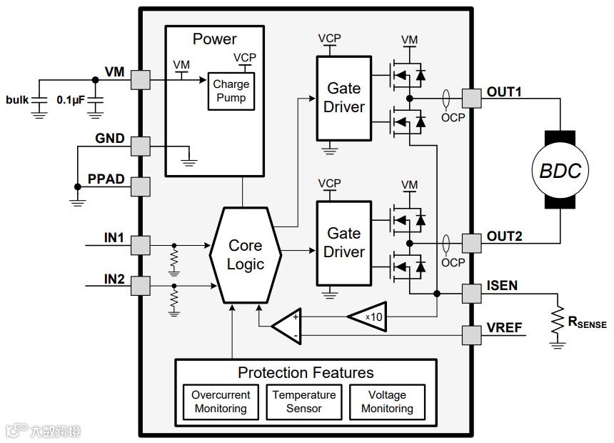 如上图所示,它通过两个逻辑输入控制由四个N沟道金属氧化物半导体场效应晶体管(N-MOSFET)组成的H桥驱动器。芯片内部集成了电压,电流检测,外部有感测电阻器和PWM控制接口,并集成保护电路。通过增加电荷泵(Charger Pump)可在内部全面提升VM(电源),使得N-MOSFET的性能增强,来提高效率。根据模拟输入VREF和ISEN引脚上的外部感测电阻器来实现电流的感应和调节。