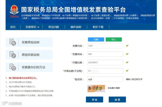 查验方法与纸质发票相同,均需在右侧查验区域填写完整的发票代码、发票号码、开票日期、开具金额(不含税)信息。