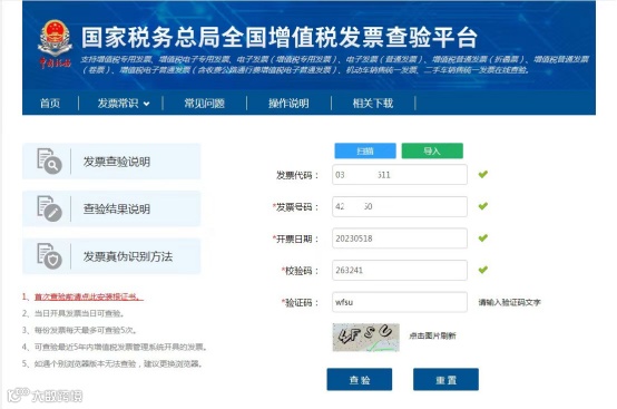 注:发票代码目前必须填写,否则会跳出提示“请输入正确发票号码”。