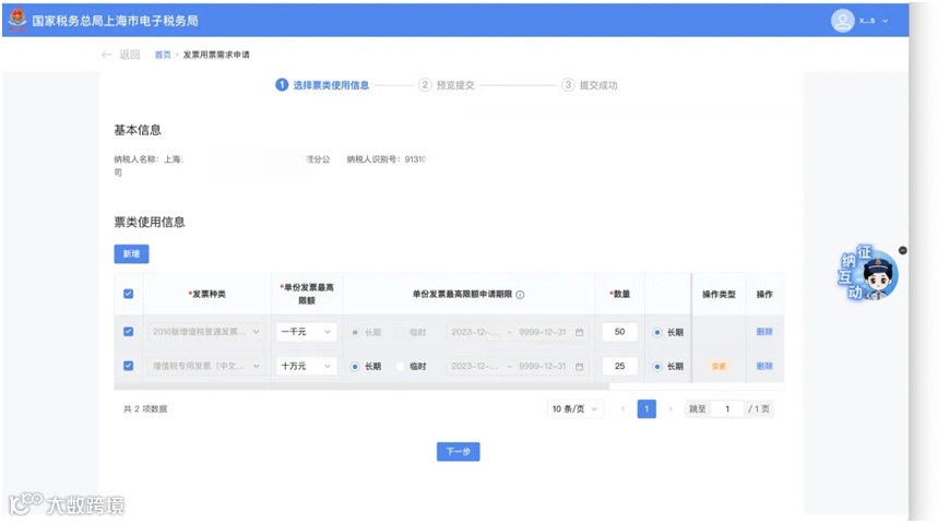 新电子税局-【我要办税】-【发票业务】-【发票用票需求申请】
