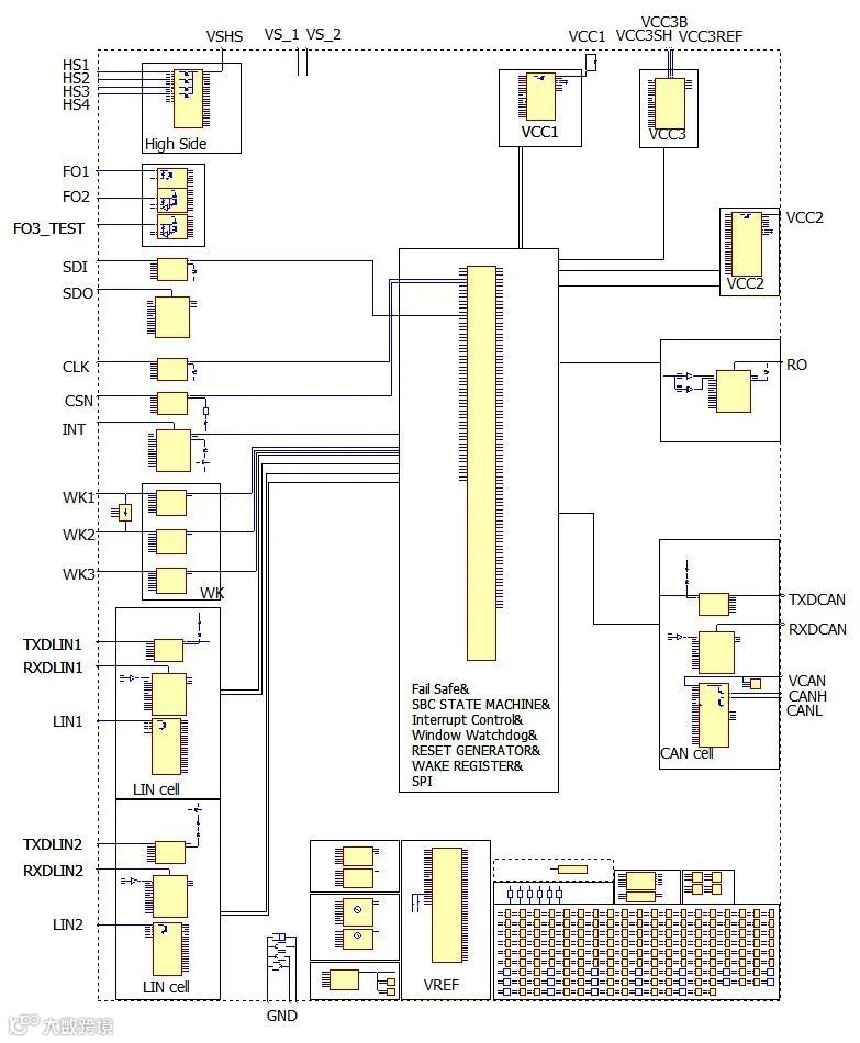 为了让大家能够更直观的了解芯片中的功能布局,平台君的小伙伴对芯片的内部电路也进行了详细分析,现在,让我们通过电路图和概貌图一同探索这款芯片吧。