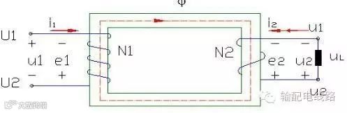 变压器是利用电磁感应原理制成的静止用电器。当变压器的原线圈接在交流电源上时,铁心中便产生交变磁通,交变磁通用φ表示。原、副线圈中的φ是相同的,φ也是简谐函数,表为φ=φmsinωt。由法拉第电磁感应定律可知,原、副线圈中的感应电动势为e1=-N1dφ/dt、e2=-N2dφ/dt。式中N1、N2为原、副线圈的匝数。由图可知U1=-e1,U2=e2(原线圈物理量用下角标1表示,副线圈物理量用下角标2表示),其复有效值为U1=-E1=jN1ωΦ、U2=E2=-jN2ωΦ,令k=N1/N2,称变压器的变比。由上式可得U1/ U2=-N1/N2=-k,即变压器原、副线圈电压有效值之比,等于其匝数比而且原、副线圈电压的位相差为π。
