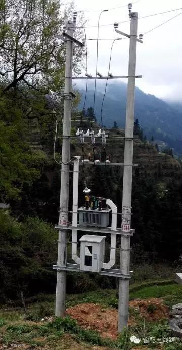 当配电变压器容量在50KVA~315KVA时一般采用双杆式配电变压器台。配电变压器台由一主杆水泥杆和另一根副助杆组成,主杆上装有高压跌落式熔断器及高压引下线,副杆上有二次反引线。双杆配电变压器台经单杆配电变压器坚固。