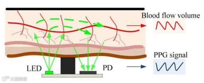 光电容积描记法(Photo plethysmo graphic,简称PPG)。简单来说,就是基于物质对光的吸收原理,通过智能手环/手表的绿色LED灯搭配感光光电二极管,用光检测一段时间血管的扩张收缩。由于血液是红色的,它可以反射红光而吸收绿光,在心脏跳动时,血液流量增多,绿光的吸收量会随之变大;处于心脏跳动的间隙时血流会减少,吸收的绿光也会随之降低。因此,根据血液的吸光度,心率检测芯片可以测量出心率。