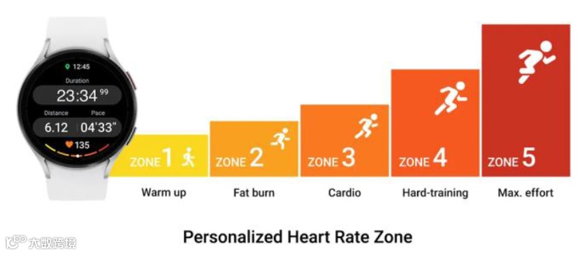 然后在三星官网,平台君看到如下手表的显示提示,不同程度的运动心率状态以不同颜色显示,和专利的如出一辙!