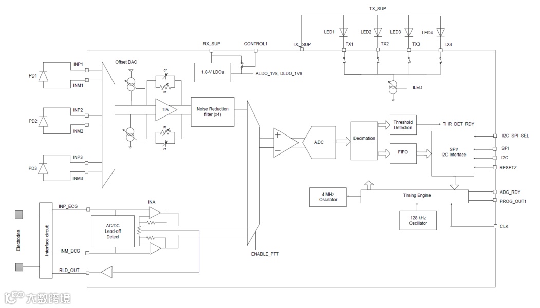 芯片外部的四个二极管(LED1~LED4)用来向人体发送光学信号,可外接三个光电二极管(PD1~PD3),支持时分多路复用PD输入以接收来自人体的信号,先经过TIA、噪声过滤模块、再经过ADC转换为数字信号,数字模块大概占整个芯片面积的20%。该芯片支持SPI和I2C两种接口。
