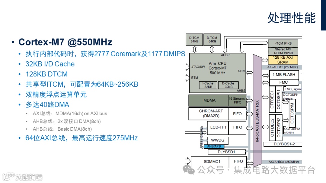 STM32H723作为STM32H7系列中主打性价比的型号,该系列产品集成了工作频率高达550 MHz的Arm® Cortex®-M7内核(具有双精度浮点单元)。在 550MHz 的CPU主频下,从Flash执行程序时,能够实现2778 CoreMark /1177 DMIPS 的性能,借助L1缓存可实现零等待执行;L1缓存(32 KB的I-缓存 +32 KB的D-缓存)提高外部存储器的执行性能。平台君觉得,作为单核架构的芯片,这样的性能已经算得上是超高的了。