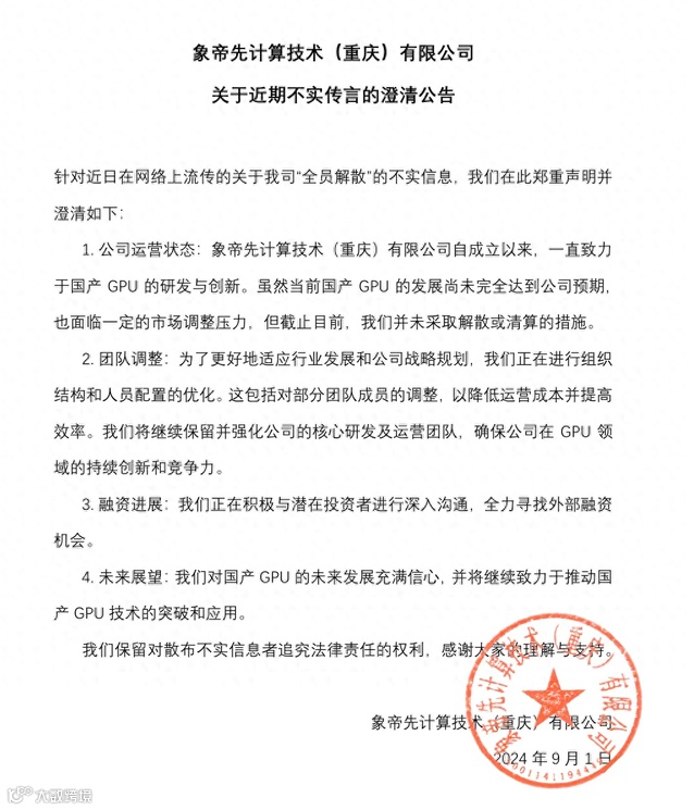 最近关于芯片行业的好消息不多,坏消息倒是一个接一个。周末又发生了一件让芯片从业者比较揪心的事情,那就是传闻国产GPU独角兽象帝先全员解散。不过今天象帝先发文辟谣:未解散或清算 但在优化人员配置。后续具体情况如何,平台君的小伙伴们会密切关注。