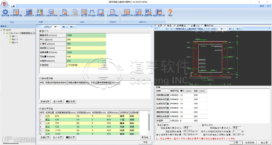 道亨电缆土建设计程序依据《Q/GDW11187-2014明挖电缆隧道设计导则》《Q/GDW 11186-2014暗挖电缆隧道设计导则》《混凝土结构设计规范GB50010-2010》《建筑结构静力计算手册(第二版)》等最新标准规范,基于道亨国产BIM技术平台自主研发,支持参数化及几何建模技术实现电缆井、电缆沟、隧道等土建模型的构建,提供电缆隧道和工井的内力分析,支持多族断面配筋计算、地基承载、结构抗浮力的计算,自动输出计算书与施工图,降低工程建设成本,满足国网和南网对电缆工程土建设计的要求。