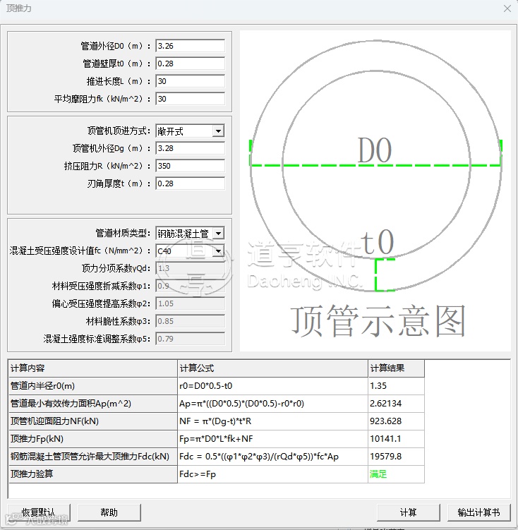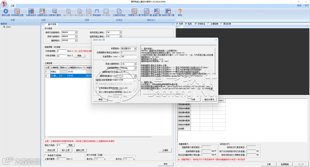 道亨电缆土建设计程序1.50版本新增四大辅助计算,包括顶管推力计算、预埋件计算、裂缝计算及锚固长度计算。新功能均支持用户自定义参数,便于用户根据自身设计需求进行灵活调整。此外,程序可直接输出计算书,为用户提供详细、全面的计算结果,更好地满足设计需求。
