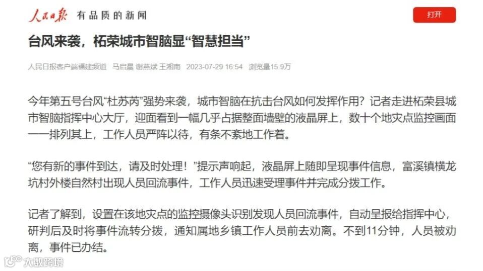 近日,福建各地全力以赴抗击超强台风“杜苏芮”,积极开展抢险救援,尽最大努力保障群众生命财产安全,恢复正常生产生活秩序。浪潮软件助力柘荣县打造的城市智脑,在上线后首次抗台实战中发挥积极作用,得到了人民日报客户端的报道。