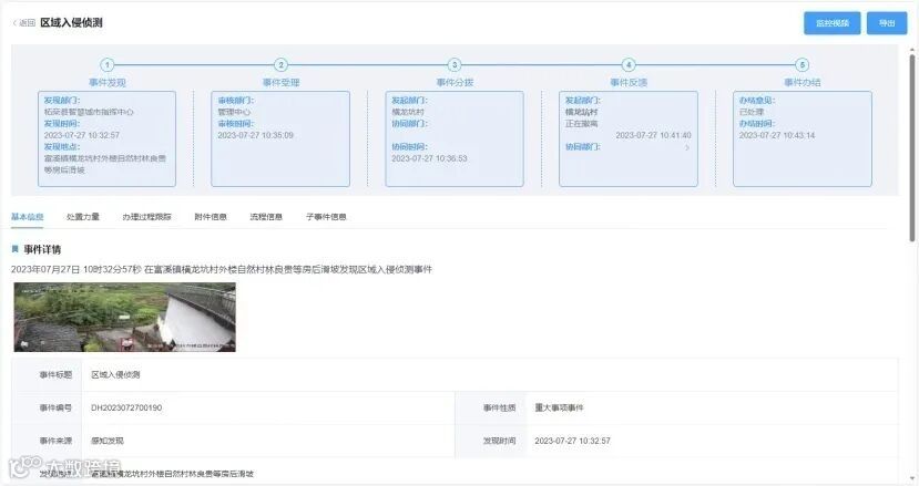 记者了解到,设置在该地灾点的监控摄像头识别发现人员回流事件,自动呈报给指挥中心,研判后及时将事件流转分拨,通知属地乡镇工作人员前去劝离。不到11分钟,人员被劝离,事件已办结。