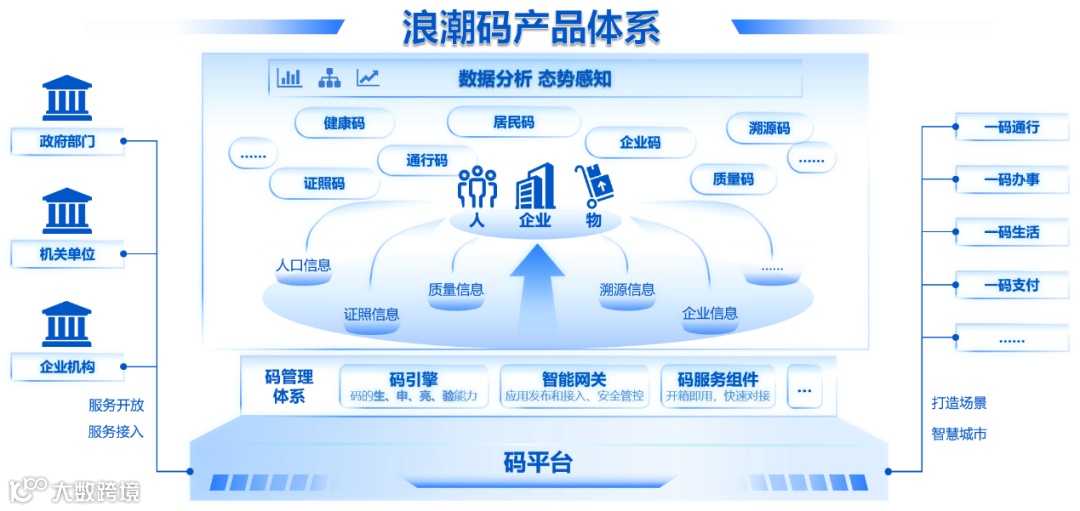 浪潮码平台基于“一码通行”理念进行顶层设计,通过融合多维数据,在多种场景中实现 “多码合一、一码互联、码上服务”。浪潮码平台提供码基础支撑能力,为广大企业、群众提供一种新型信息交互方式,同时为城市建设优化、公共交通改善、政务服务能力提升等提供数据和服务支撑,助力 “一码通行”生态建设。