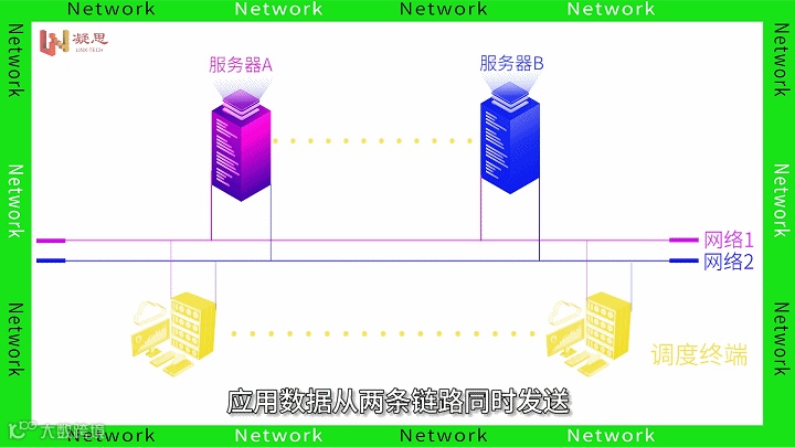 网络1和网络2是互相独立的两个网络。服务器A与B通信时,在网络1和网络2同时建立连接。