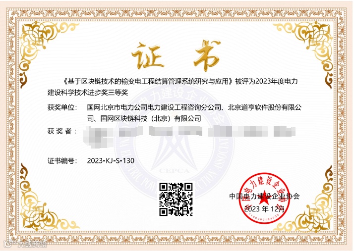 道亨软件再创佳绩,公司参建的“基于区块链技术的输变电工程结算管理系统研究与应用”项目被评为2023年度电力建设科学技术进步奖三等奖。