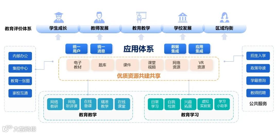 浪潮构建面向教育教学、教育评价、教育管理、教育资源与公共服务为一体的教育应用体系,支撑教、学、管、评、测各类应用场景,通过汇聚各类教育数据,为大数据分析决策提供支撑。
