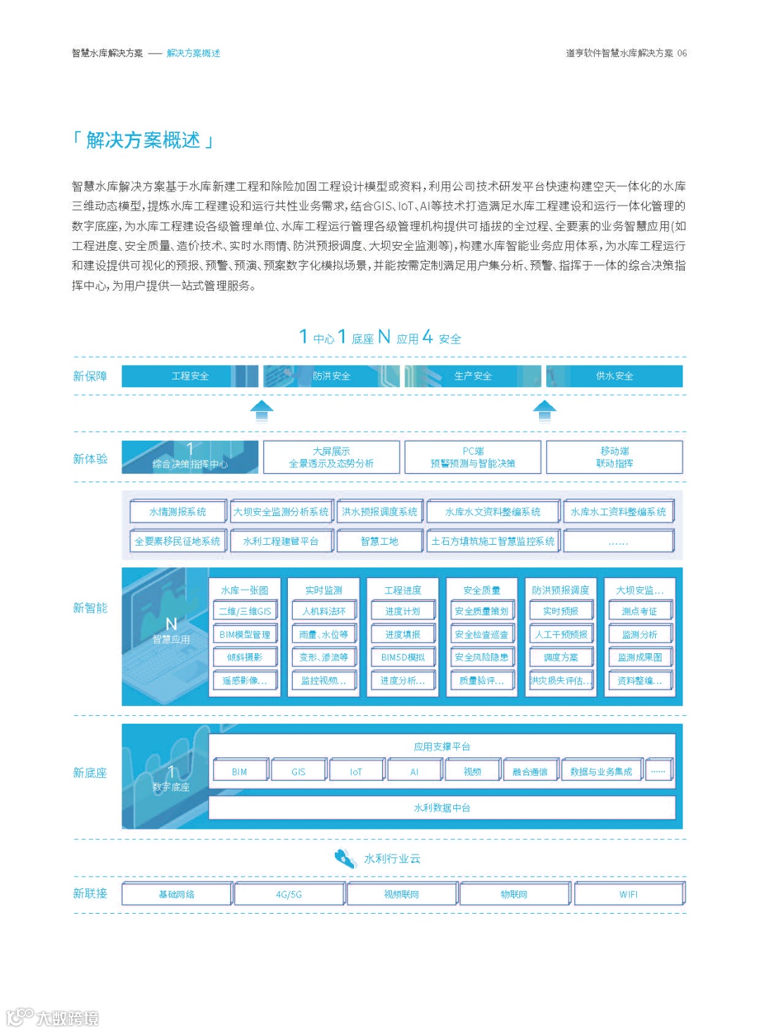 相关产品依托公司自主技术平台,建设水库工程全方位感知、一体化监测的数字底座,并依托大数据、人工智能等技术开发水库工程相关算法及模型,构建智慧水库业务应用体系,面向参建各方提供可视化、智能化的预报、预警、预演、预案模拟场景,可为水库工程建设管理和运行阶段的精准化决策提供支撑。