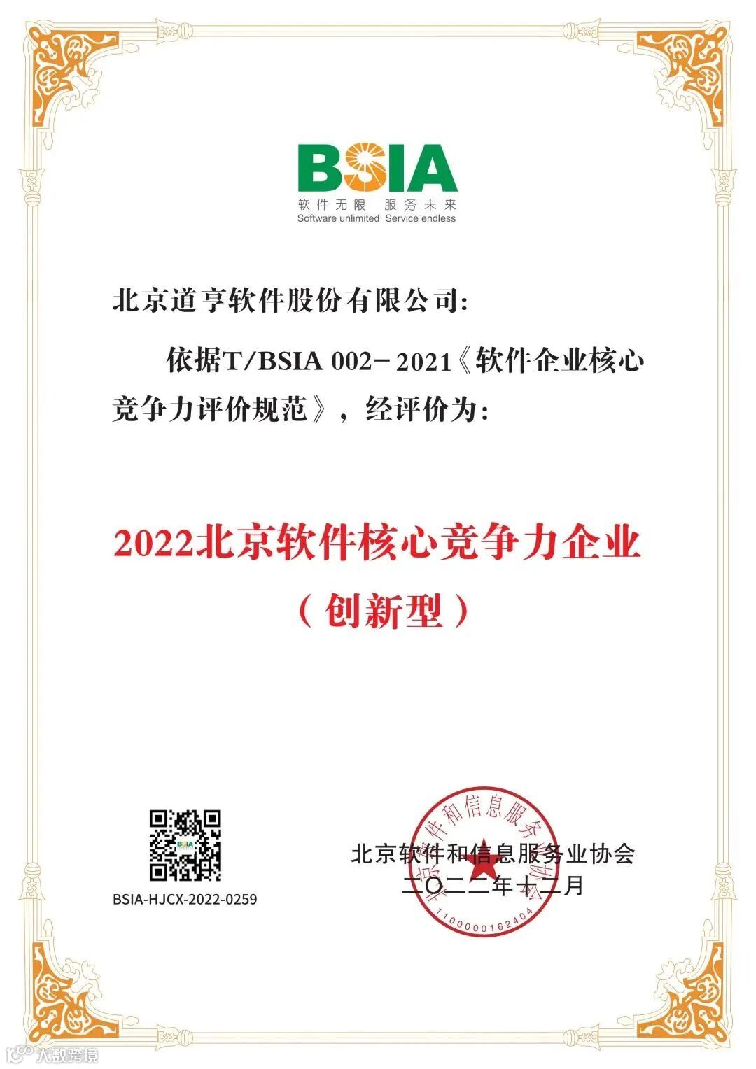 2022年12月28日,北京软件和信息服务业协会(以下简称“北京软协”)发布了《2022北京软件企业核心竞争力评价报告》。道亨软件作为国家级和北京市重点专精特新“小巨人”企业,凭借卓越的科技创新实力和出色的市场表现,再次入选“2022北京软件核心竞争力企业(创新型)” !