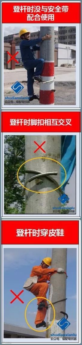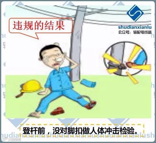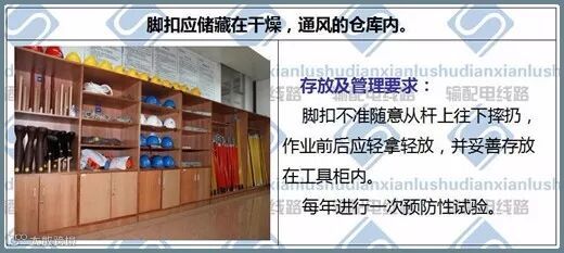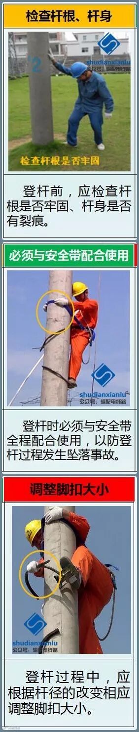 8.登杆前,按电杆的直径选择脚扣大小,检查试验合格证试验日期是否在有效期内;使用前应作外观检查,检查各部位是否有裂纹、腐蚀、开焊等现象用;登杆前,应对脚扣做人体冲击检验。