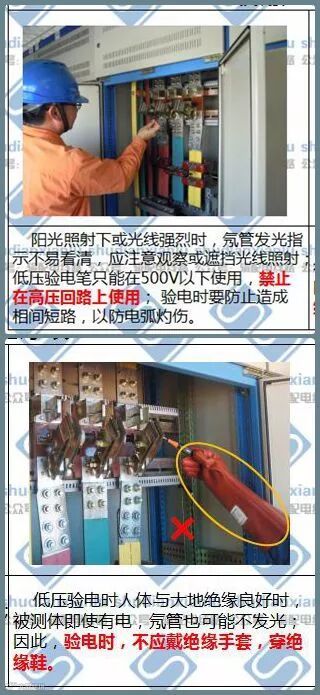 4.低压验电时人体与大地绝缘良好时,被测体即使有电,氖管也可能不发光;因此,验电时,不应戴绝缘手套、穿绝缘鞋。