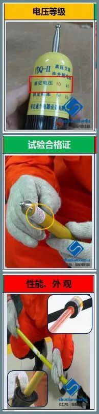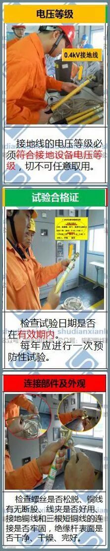 2. 使用接地线时,应检查接地线的电压等级是否相符,试验合格证下班试验日期是否在有效期内,检查接地线螺丝是否松脱、铜线有无断股、线夹是否好用、接地铜线和三根短铜线的连接是否牢固,绝缘杆表面是否干净、干燥、完好。