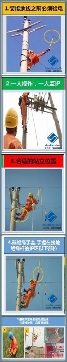 3. 装设接地线时,要先装接地端,后接导线端;先挂低压,后挂高压;先挂下层,后挂上层。拆接地线时的顺序与此相反。装、拆接地线时,人体不得碰触接地线。