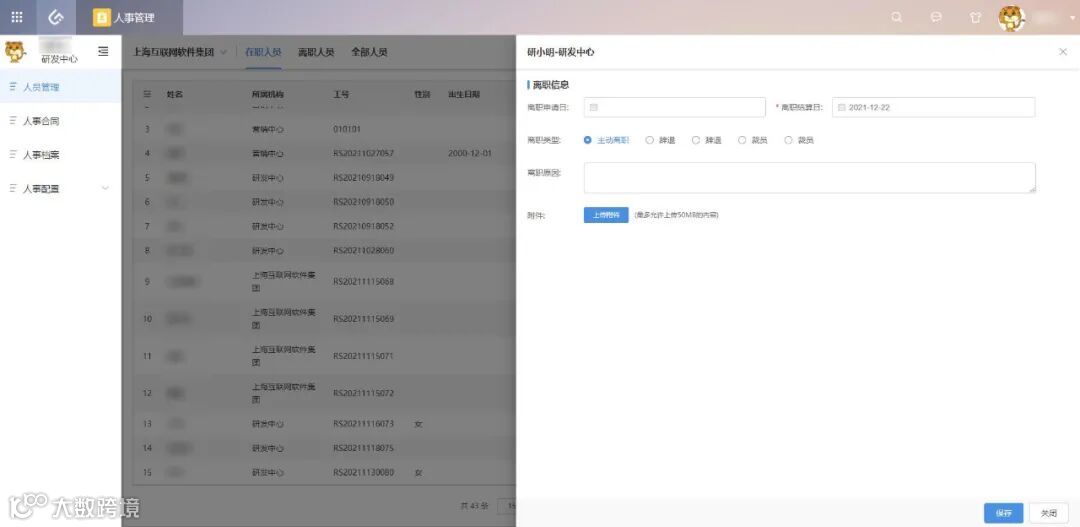员工入、转、调、离信息依靠人工录入更新,不仅填报耗时,数据准确性也无从查证,互软UMIS智能协同管理平台人事管理模块,在职员工一键离职,手动设置离职结算日,到期自动移入离职人员列表。员工从一个岗位到另一个岗位,只需在线更改所属部门及岗位,完成档案、薪酬、绩效等内容的快速“迁移”。