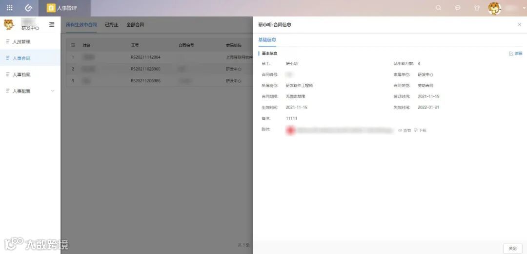 支持劳动合同、劳务合同、用工协议、保密协议、实习协议、三方协议等各类合同和协议的管理。试用期到期、合同到期时间一目了然,到期合同归入已终止类别。