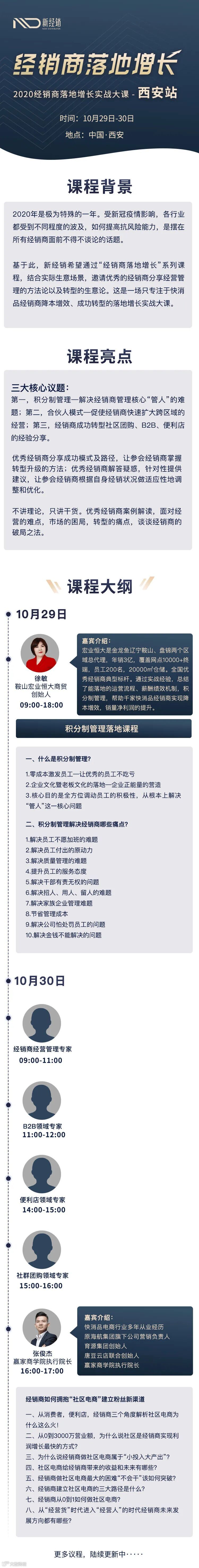 PS:新经销将于10月29日-10月30日在西安举办,第7期「经销商落地增长实战大课」,为经销商提供实战经营方法论,提高抗风险能力,从内部人员和业务管理,到外部快消新零售,挖掘更多生意机会!因受场地限制,限额150名,满额关闭!
