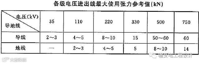 进出线构架外侧的导线,即从进出线构架到线路终端塔,这是一个孤立档,各种条件变化较大,往往是变电站设计时,各回进出线终端塔位置和导线型号还没有最终确定,由于站外地形复杂,各回路终端塔位置相差很大,偏角大小不同,导线悬挂点高低不一 ,再由于负荷不同,导线型号差别也较大,因此,该档是按最大使用张力设计的。变电站建成投产后,各终端塔位置不论远近,导线截面不论大小,其允许张力均不得超过线路电气专业提供的数值,一般可用调整弧垂的方法,以满足允许张力的要求 。