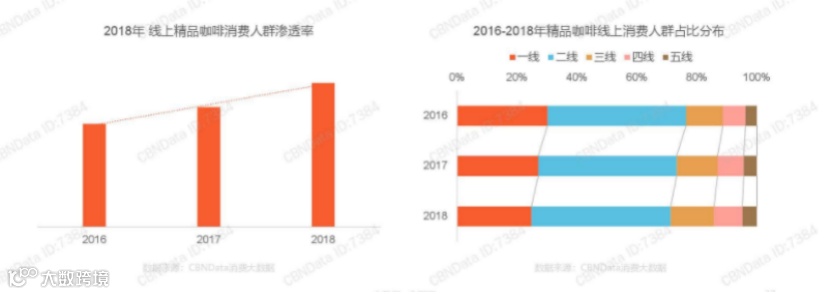 对咖啡的需求,不止体现在量上,还体现在对咖啡品质的追求。普通的速溶已经不能完全满足下沉市场消费群体需求,更具有品质感的精品咖啡也越来越受欢迎。根据天猫精品咖啡的消费数据显示:下沉市场的咖啡进阶追求明显,2016-2018年期间,三四五线城市的线上精品咖啡人群占比逐年增长,品质咖啡消费量提升。