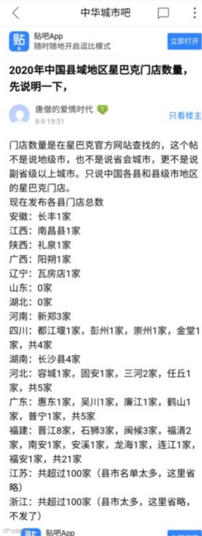 数据内容:县城星巴克咖啡店分布情况,数据来源:贴吧数据