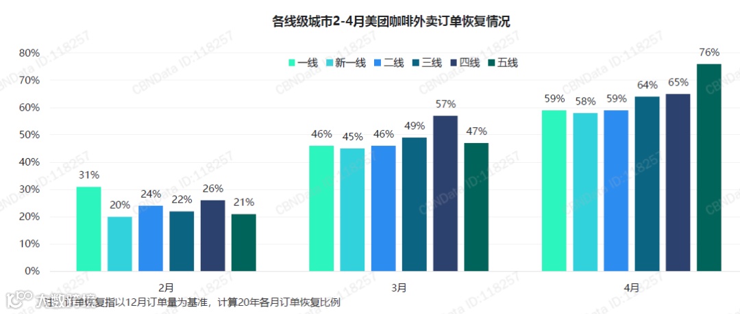 今年疫情后,下沉市场的咖啡需求回暖也快。除线上咖啡市场的增长外,线下咖啡消费需求也有提升。根据Talking Data的数据显示:三、四月份下沉城市疫情防控政策首先放宽,占全国外卖订单24%的下沉市场展现出较强的咖啡需求,三至五线城市3月订单量环比均增长100%+,4月单量已恢复至疫情前的65%。