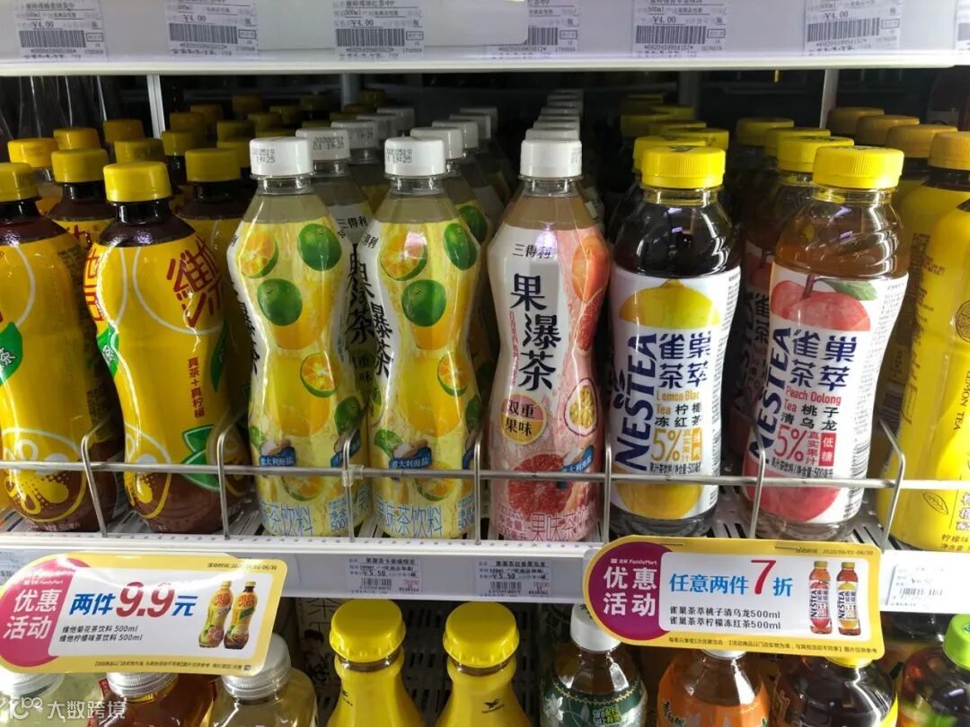 这四排货架当中有一整排货架陈列了来自各大公司和品牌的茶饮产品,但雀巢的“茶萃”用了极为显眼的文字设计强调了真实果汁、低糖、茶以及切开的水果图这几个关键元素,从所有瓶子里面“跳”了出来,“像是它迫不及待有很多话要跟我讲”施文说。