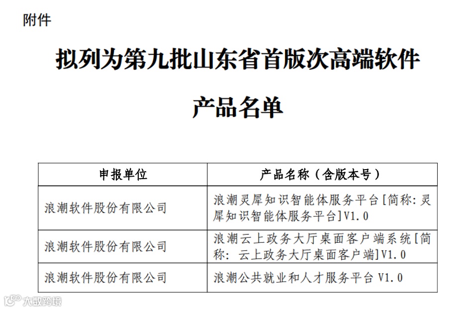 近日,山东省工信厅公示第九批山东省首版次高端软件产品名单,浪潮软件三款产品成功入选。本次入选的产品分别是“浪潮灵犀知识智能体服务平台V1.0”、“浪潮云上政务大厅桌面客户端系统V1.0”和“浪潮公共就业和人才服务平台V1.0”。