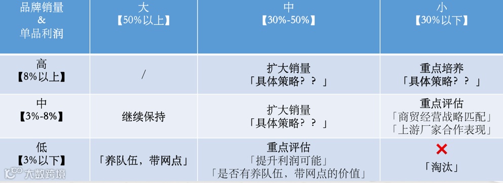例如利润3%以下的产品可能是销量比较大的产品,我们就培养队伍,打通网点带入高利率的产品;而利润低,销量又小的产品可以淘汰。而利润率在3%~8%的,销量也不算太低的产品,就是要拿出策略做的产品;当然利润率更高的产品更要做。