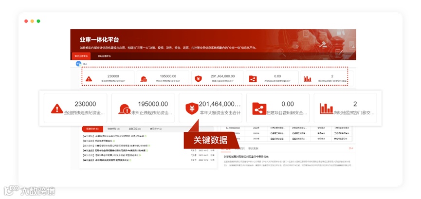 聚焦审计工作人员重点关注的审计指标,重点展示违规违纪资金、未纠正违规违纪资金、本年度大额资金支出、在建项目费用超支金额、向纪检监察部门移交案件线索等数据指标,为审计工作有针对性的开展提供方向。