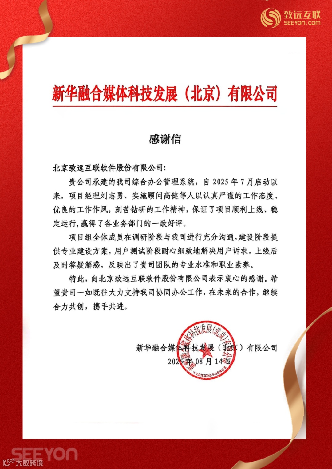 这份感谢信不仅是一份荣誉,更是持续前进的动力。未来,致远互联将继续深耕协同管理领域,不断拓展业务应用的深度与广度,全力推动新华融合媒体科技发展(北京)有限公司的数智化建设迈向更高台阶。