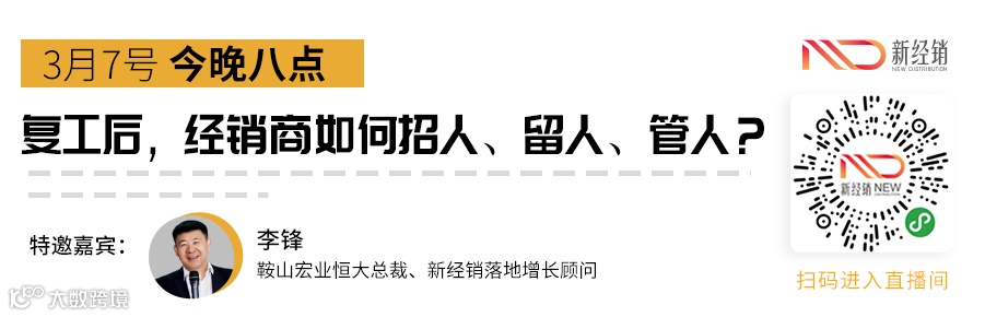 PS:今晚8点,鞍山宏业恒大商贸有限公司总裁李锋先生就《复工后,经销商如何招人、留人、管人?》话题开启微信直播,和您探讨经销商在人才招聘途径、新人培训、晋升制度等方面的相关热点话题。