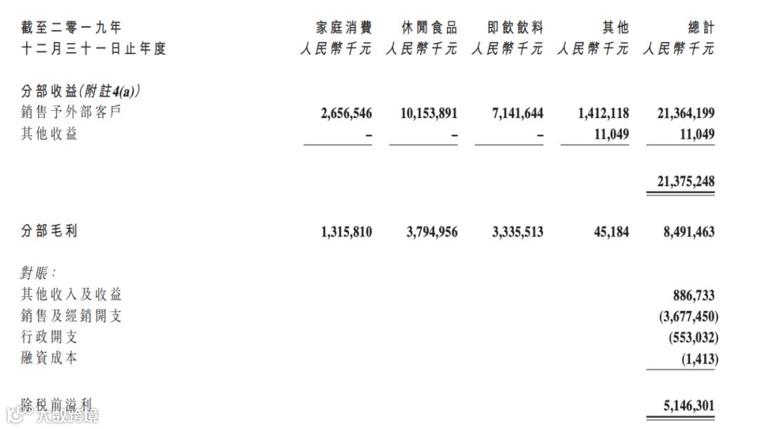 查阅财报数据可得知,过去的一年里家庭消费产业的销售收入由2018年的人民币18.76亿元增加41.6%至2019年的人民币26.57亿元。但是就目前来看,在集团三大产业分部里落后于休食和饮料产业。