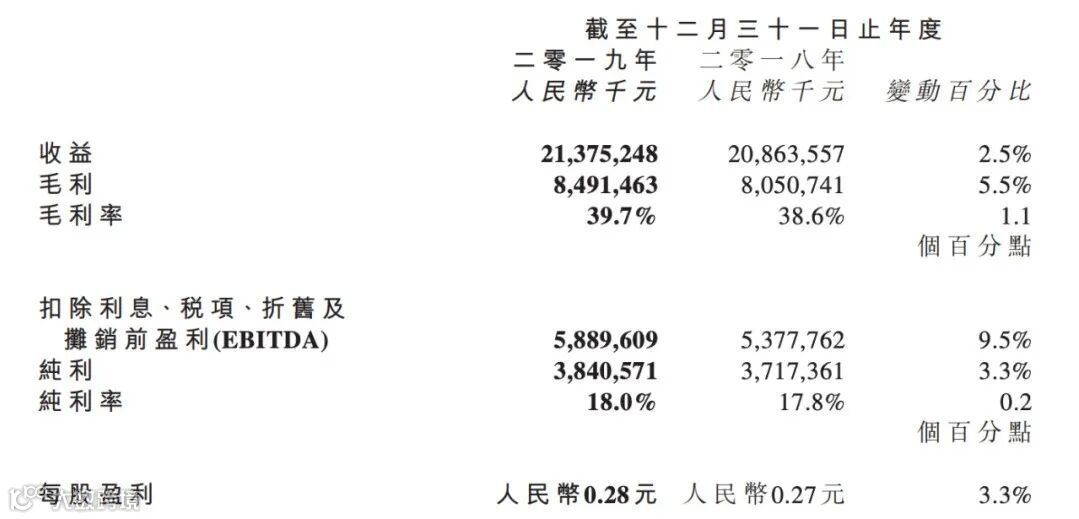 2019年全年,达利集团共实现收入213.8亿元人民币,较2018年(208.6亿元)增长了2.5%。其中净利润38.4亿元,较去年稳步增长。集团整体毛利率为39.7%,比去年同期提升1.1个百分点。