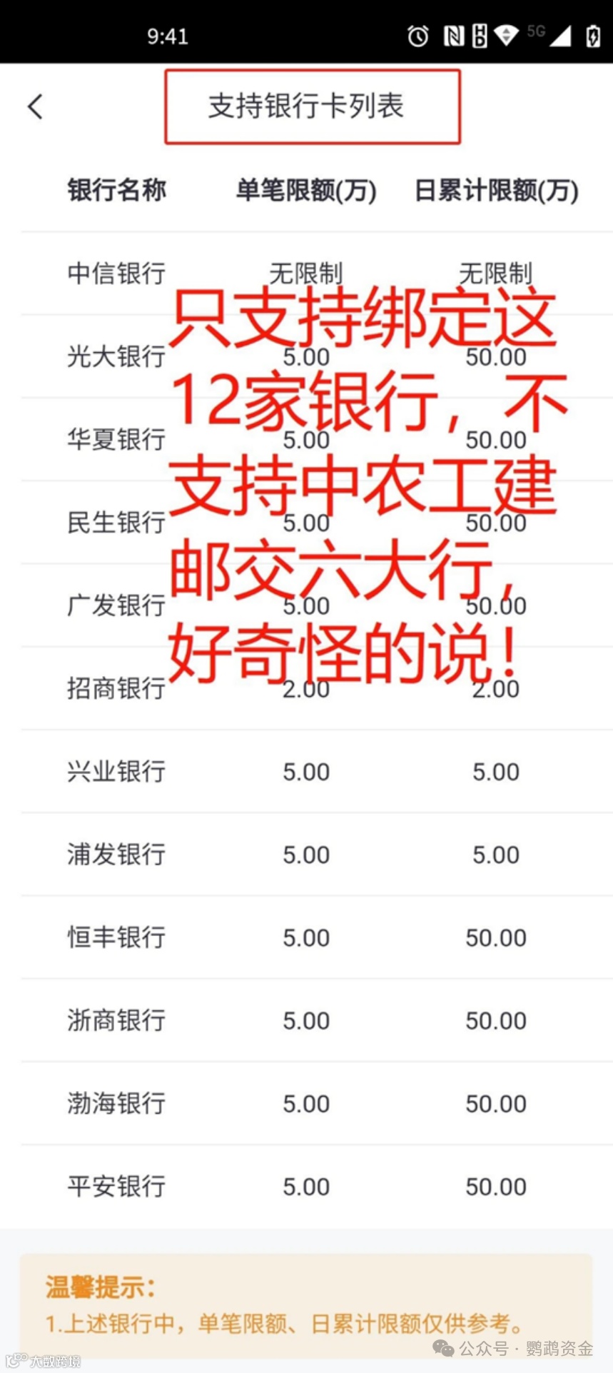 3.开通二类账户,绑定银行卡,支持12家但不支持六大行(绑定他行卡可以转出资金500万,有中信一类卡不限额)