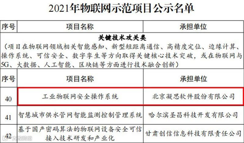 近日,工信部公布2021年物联网示范项目名单(总计179个项目),其中“关键技术攻关类”为42个项目,凝思软件申报的工业物联网安全操作系统项目成功入选“关键技术攻关类”示范项目名单。