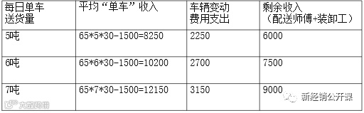 配送师傅0底薪,每送1吨货,便给予1辆车65元的费用。另外规定:无论上班与否,每辆车每天上交50元的固定“租费”。