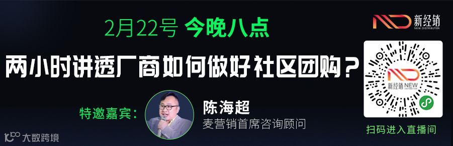 PS:今晚8点,新经销创始人赵波将连线京东社区团购联盟联合发起人陈海超先生就《2小时讲透厂商如何做好社区团购》话题开启微信直播,和您探讨社区团购的相关热点话题。